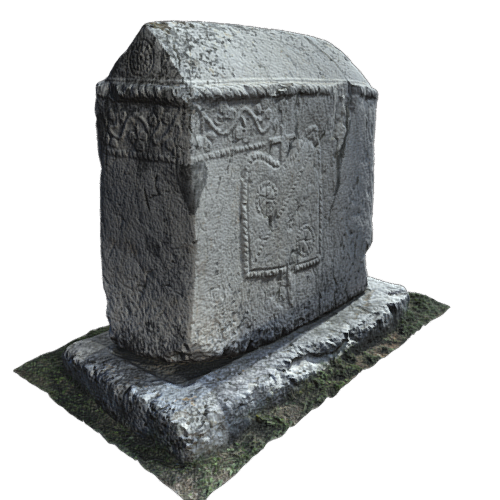 High gabled roof stećak with a monolith base. Decorated with motives of a twisted rope and starry shield with a sword. Dimensions: height 124 cm, width 87 cm, length 160 cm, height of base 32 cm, width of base 113 cm, length of base 181 cm.